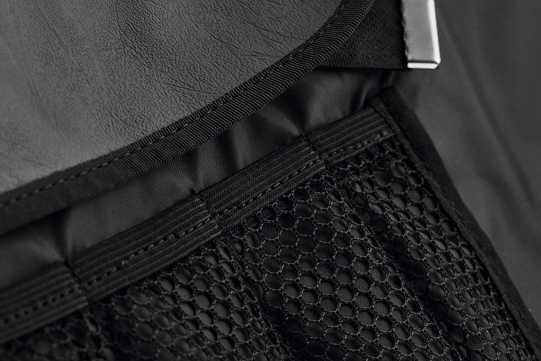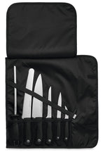 Fekete szintetikus anyagból készült, mosható, professzionális tépőzáras gurulós táska. Alkalmas 6 kés vagy eszköz tárolására, legfeljebb 26 cm pengéjű.