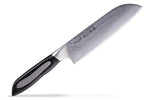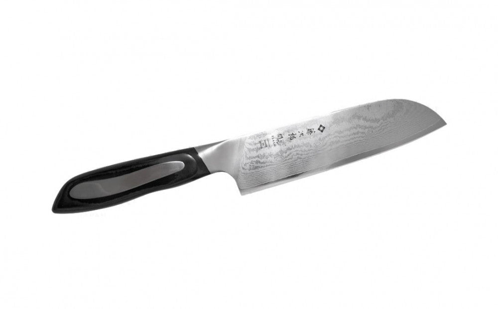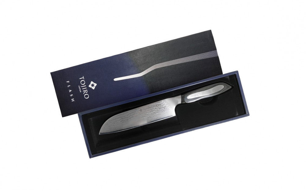 Tojiro Flash DP Damascus Santoku 18 cm hosszú damaszk acél pengével, laminált markolattal.
