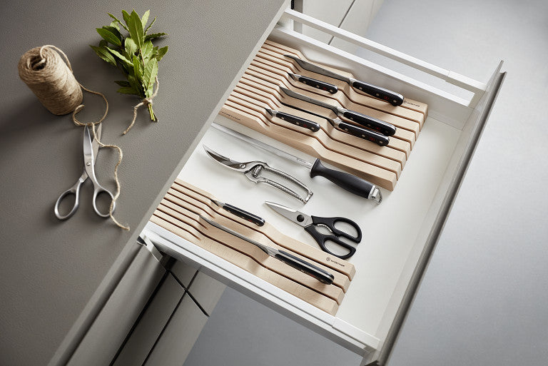 Késrendező, amely fiókba helyezhető. A Wüsthof kések megóvásra érdemesek: ez a fiókbetét minden szabványos evőeszköz fiókhoz és kihúzóhoz illeszkedik, és 7 kés számára biztosít helyet (3 nagyobb, akár 23 cm pengével, és 4 kisebb kés). A rekeszek szilárdan tartják a pengéket, megakadályozva a kopást vagy sérülést, amelyet beszorulás vagy ütődés okozhat.