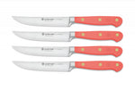 Wüsthof Classic Colour 4-piece Steak Knife Set with 12 cm smooth edge blade and coral peach handle.
