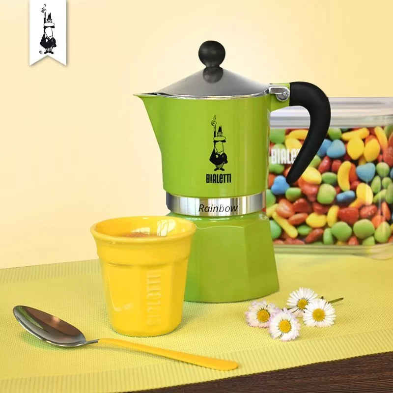 A Rainbow kollekció friss, energikus esztétikát visz a tradicionális olasz kávékultúrába. Ez a feltűnő zöld kiadás gyönyörűen frissíti fel a híres nyolcszögletű formát, így tökéletes választás a világos és színes konyhák kedvelőinek. A lenyűgöző, játékos megjelenés mellett a jellegzetes oktogonális kialakítás garantálja a tökéletesen egyenletes hőeloszlást a kiváló minőségű ízkioldás érdekében, míg a tartós alumínium szerkezet gondoskodik a kávé kiváló hőtartásáról.